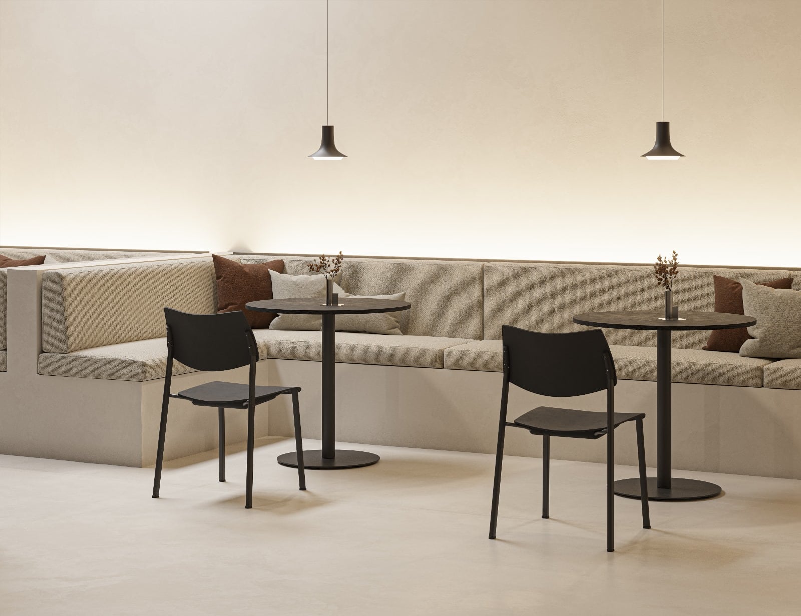 En restaurant stiller særlige krav til indretningen. Møblerne skal kunne holde til daglig brug, være lette at vedligeholde og samtidig understøtte stedets visuelle identitet. Vi leverer blandt andet: